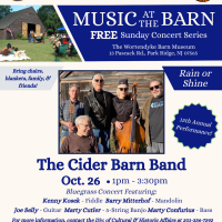 Our final event for the month will be the 15th Annual Performance from “The Cider Barn Band” at the Wortendyke Barn Museum, the final performance of our Music at the Barn 2025 series, featuring local bluegrass legends Kenny Kosek, Barry Mitterhof, Joe Selly, Marty Cutler, and Marty Confurius. The performance will be on October 26 at 1:30PM at 13 Pascack Rd., Park Ridge and is FREE entry.