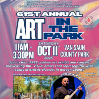 Our second event is the 61st Annual Art in the Park; a FREE outside art exhibit and concert, showcasing 100+ visual artists that represent the wide scope of the artistic diversity in Bergen County. The event will be held on October 11 at Van Saun County Park from 11AM-3:30PM, with a music performance by Dean Shot with special guest saxophonist Greg Piccolo.