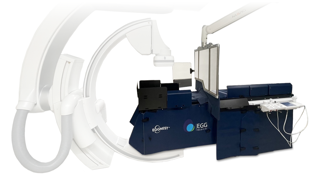 Designed with retractable flex shielding, EggNest Protect allows clinicians to position clear shields between themselves and the patient. The free movement of the shields also allows the C-arm – a mobile X-ray imaging device used to guide the procedure – to be fully maneuvered and rotated, creating optimal positioning for safe radiation exposure to the patient and staff.