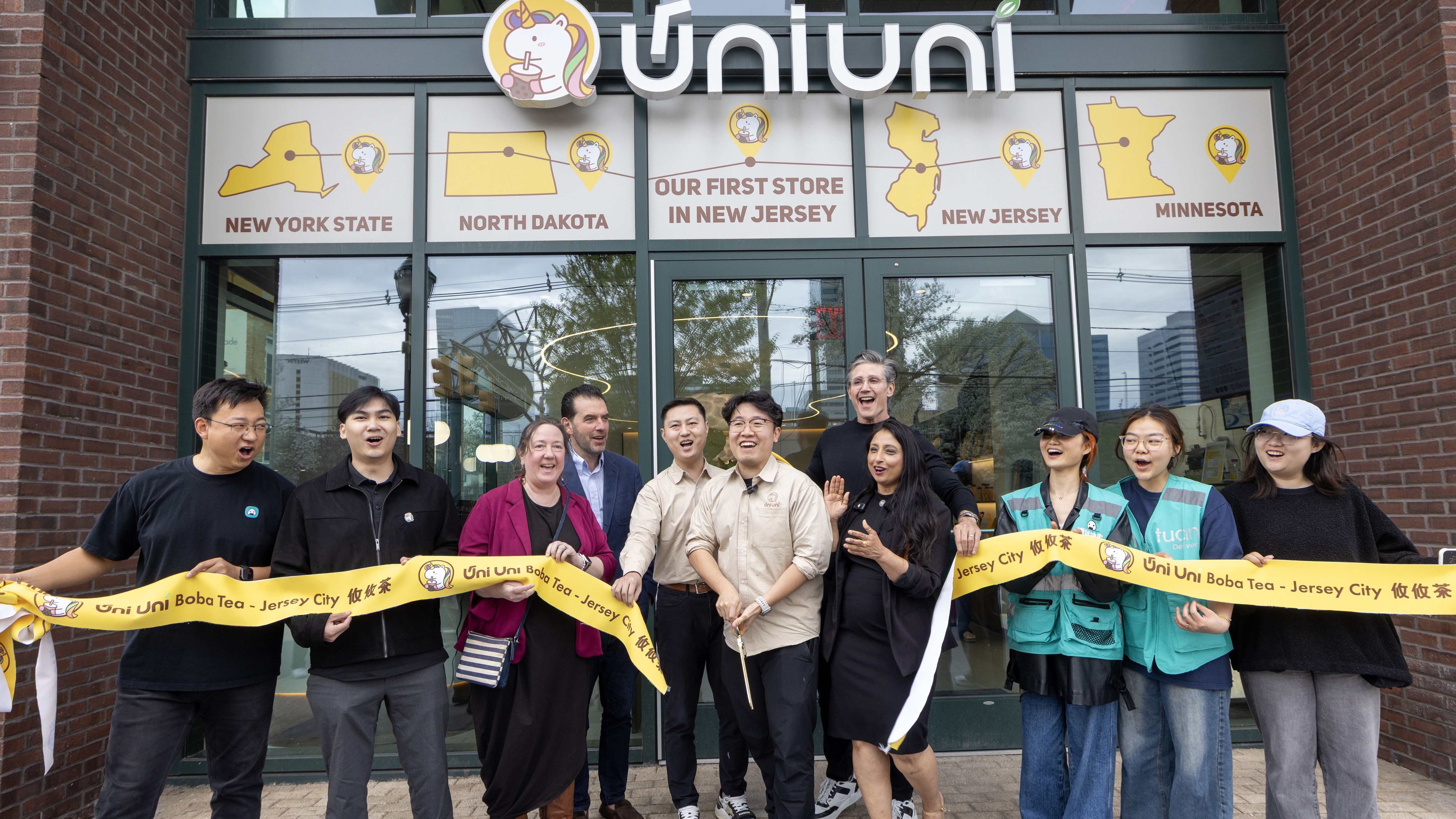 Photo Caption: Jersey City Economic Development Corporation Executive Director Mira Prinz Arey, KRE President Jon Kushner, KRE Chief Design Officer Marc Kushner, and Jersey City Councilperson At-Large Mamta Singh join the Uni Uni Bubble Tea team led by owner Patrick Jiang to cut the ribbon on Uni Uni’s new Jersey City location at 485 Marin.